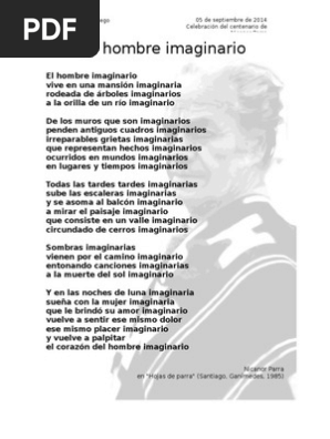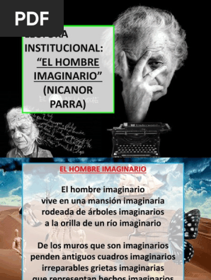El hombre imaginario del reconocido antipoeta chileno y varias veces nominado al Premio Nobel de Literatura Nicanor Parra en la voz de su autorMás videos. Ese anti no niega por supuesto la poe- sía sino 10 gastado y convencional de cierta poesía precedente. Que le brindó su amor imaginario.
