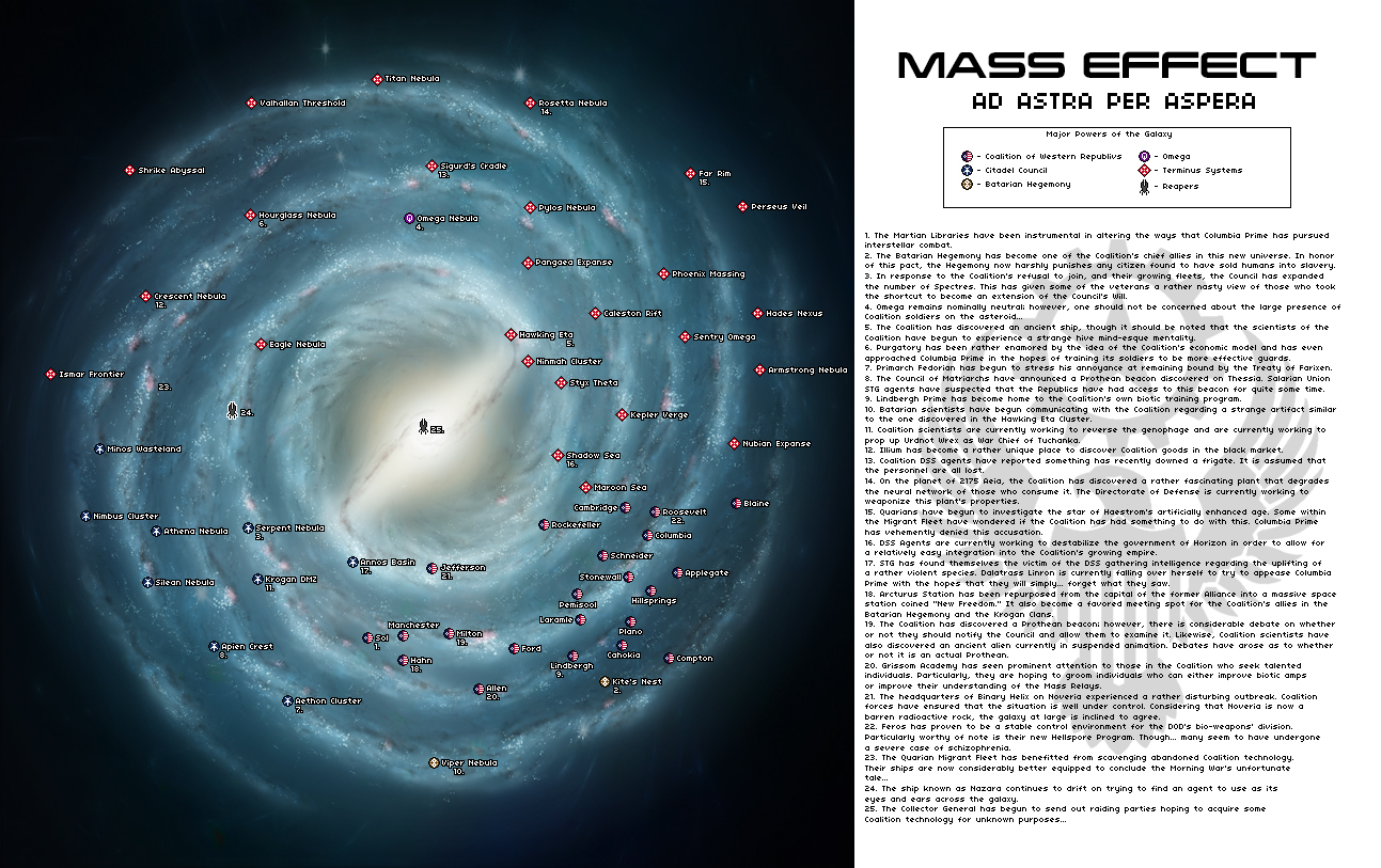 Ad Astra Per Aspera Chapter 1. Coalition Marine Corps Directorate of State Security Bureau of Special Scientific Affairs Springfield Pact United Technocracies minor Coalition allies Armament. Mass Effect Complete Walkthrough Tips Romance Guides and More.